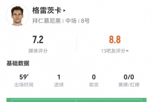 体育资讯6月30日讯 拜仁在世俱杯16强战3-2领先弗拉门戈,格雷茨卡本场数据如下: